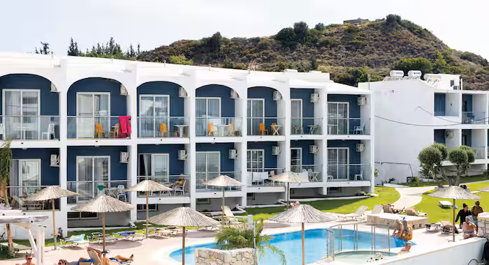 You’ll find a couple of pools a few yards away from the shoreline, including a slide-filled splash park for youngsters. Come mealtimes, a buffet restaurant’s on hand with international and Greek fare.